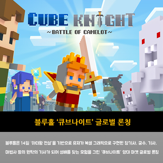 블루홀은 14일 '아더왕 전설'을 기반으로 유저가 복셀 그래픽으로 구현된 창기사, 궁수, 기사, 마법사 등의 원탁의 기사가 되어 성배를 찾는 모험을 그린 '큐브나이트' 양대 마켓 글로벌 론칭