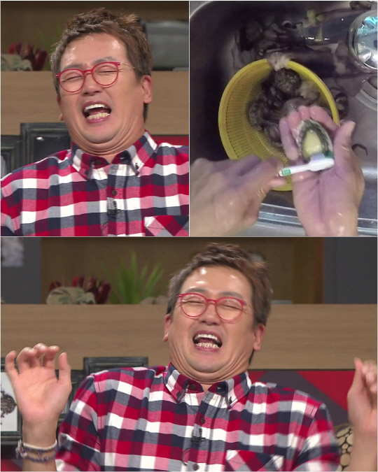 김정태는 전복을 칫솔로 닦는 꿀팁을 공개하면서 돌연 "전복한테 칫솔질을 하면 간지러워서 이렇게 한다"며 전복의 표정모사(?)를 펼쳤다.