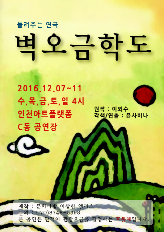 이번 공연은 본 공연으로 가기 위한 쇼케이스 성격의 공연이다. 완성도 높은 문화컨텐츠를 향한 3년 계획으로 관객과 함께 발전시켜나가는 여백이 있고, 실험적인 무대다. 한해를 정리하는 섣달 초 가족, 연인과 인천을 찾아 공연과 함께 근처 차이나타운과 월미도, 자유공원 등을 둘러보는 것도 따뜻한 나들이가 될 듯 하다.