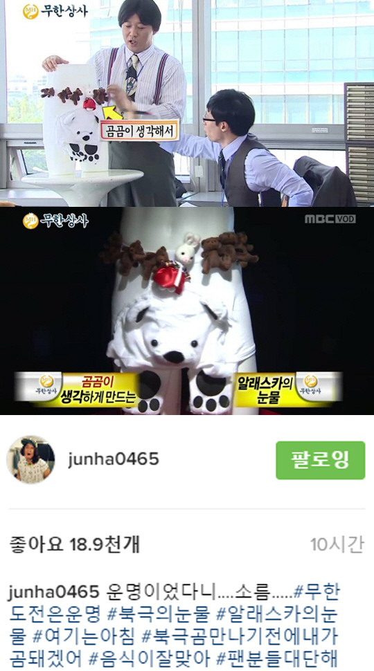 [스포츠조선닷컴 김영록 기자]'북극곰 만나기 벌칙'에 나선 정준하가 과거 '무한상사' 특집을 떠올리며 무릎을 쳤다.