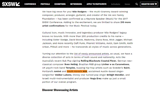 XXX는 데뷔 이전부터 끊임없이 이어져 온 해외에서의 관심을 이어갈 수 있게 되었고, 글렌체크는 2014년에 이어 SXSW에 2번째로 참가하게 되었다. 이외에도 한국 아티스트로는 루나 리, 윈디씨티, 야광토끼 등도 함께 참여한다.