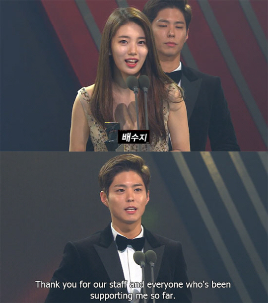 배수지는 "축제같은 시상식에 초대해주신 것만으로 감사한데 과분한 상 주셔서 감사하다. 더 열심히하라는 뜻으로 알고 좋은 활동으로 보답하겠다"고 말했다.