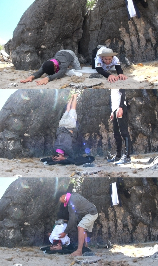 한편, 수직으로 모래 바닥 위에 거꾸로 선 윤민수의 모습을 보고 감탄하던 양요섭도 엉겁결에 물구나무서기에 도전하게 됐다. 의연하게 시범을 보였던 윤민수와 달리 양요섭은 시작부터 "못하겠다"며 흐느끼는 모습을 보였다는 후문.