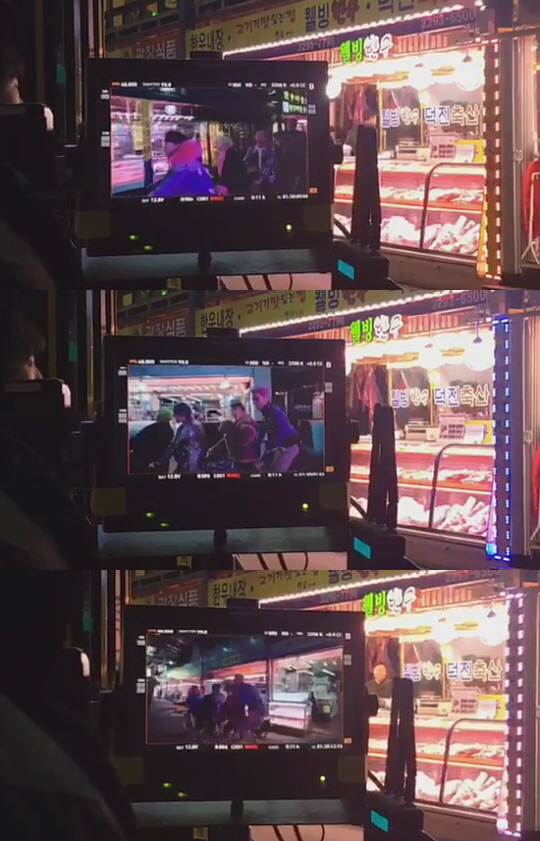 한 시장에서 뮤직비디오 촬영 중인 빅뱅. 이어 이들은 나란히 붙어 있는 5인 자전거를 타고 시장을 달리고 있는 모습이다.
