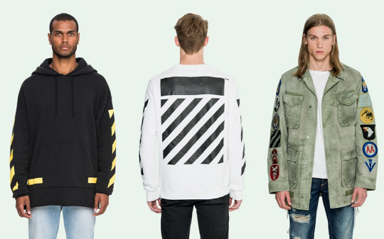 오프 화이트는 GD, 박명수, 사이먼디 등 뮤지션들에게 특히나 큰 사랑을 받고 있는 스트릿 브랜드다. 브랜드의 시그니쳐는 바로 볼드한 사선 스트라이프 프린팅. 소매, 등, 팬츠 등 다양한 위치에 들어간 스트라이프가 눈에 확 들어오는 느낌을 준다.