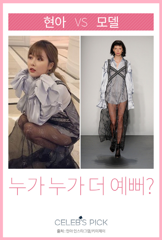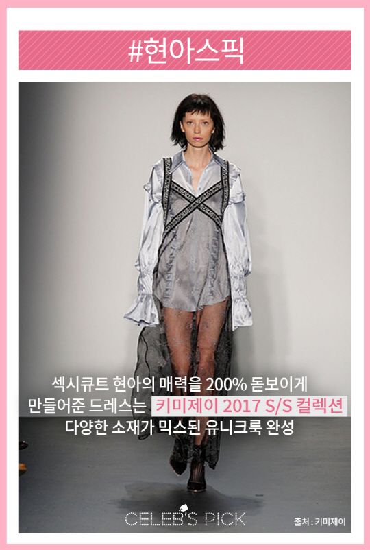 섹시&큐트 현아의 매력을 200% 돋보이게 만들어준 제품은 바로 국내 디자이너 브랜드 키미제이 2017 SS 컬렉션이랍니다. 고급스러운 광택의 블라우스와 속이 비치는 시스루 소재가 믹스되어 독특한 스타일을 완성했습니다. 키치한 현아의 분위기와도 잘 어울리는 로맨틱 스트리트 룩이 사랑스럽기까지 하네요.