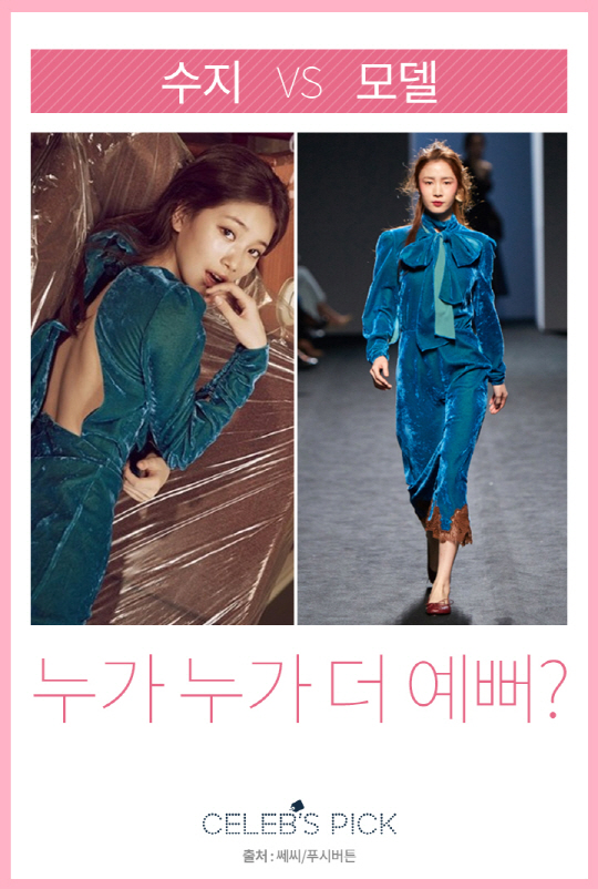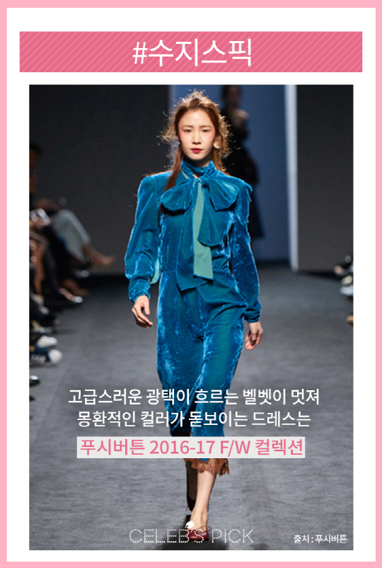 수지의 치명적인 화보를 완성해준 벨벳 드레스는 국내 디자이너 브랜드 푸시버튼의 2016-17 F/W 컬렉션입니다. 고급스러운 광택이 흐르는 청색 벨벳이 독특해요. 몽환적인 컬러감이 돋보이는 유니크한 드레스도 수지가 입으니 우아하네요.