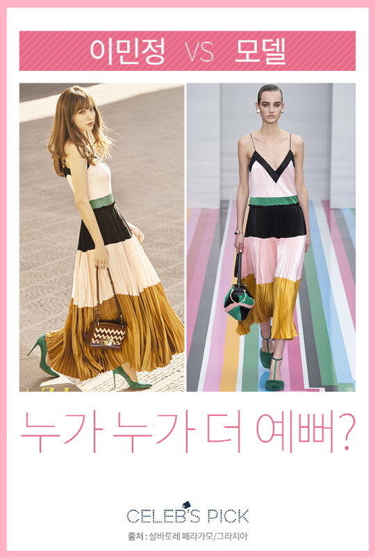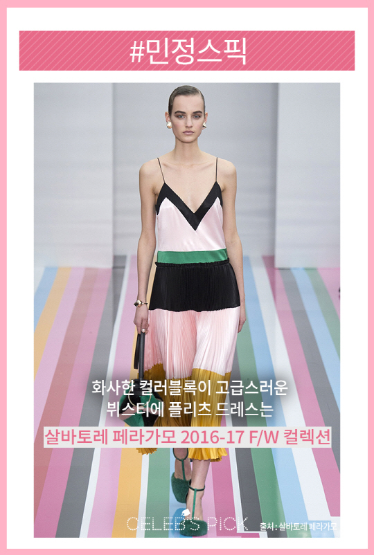 이민정은 핑크 그린 골드의 세련된 컬러 블록 드레스를 입고 우아한 화보 룩을 완성했는데요. 다양한 컬러가 조화를 이루는 뷔스티에 플리츠 스커트는 바로 살바토레 페라가모 2016-17 F/W 컬렉션입니다. 이민정은 페라가모 2017 S/S 컬렉션에 초청받아 당시 런웨이 프론트에서 포착되기도 했었지요. 이런 화사한 컬러의 드레스로 이민정처럼 스타일에 상큼함을 더해보세요.