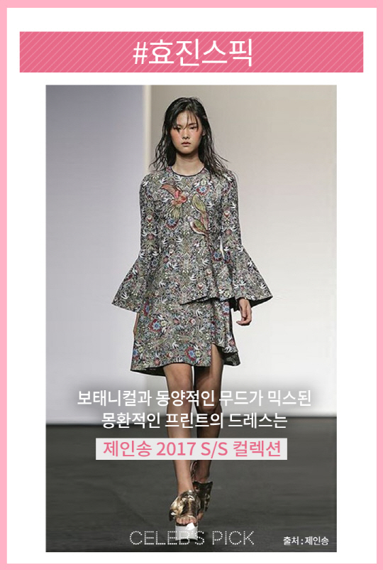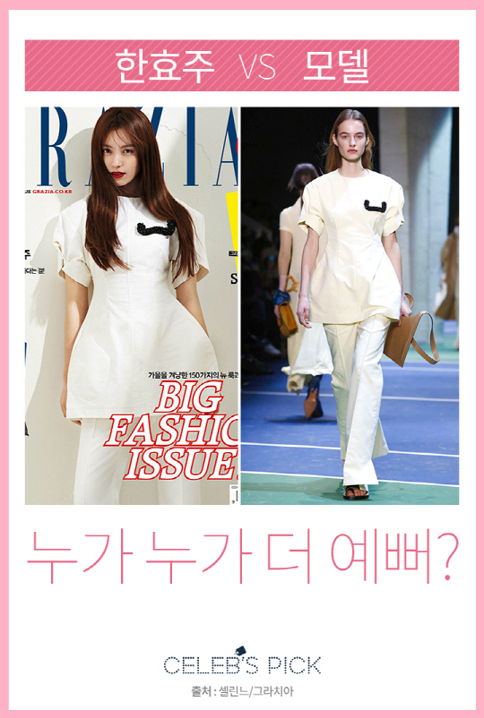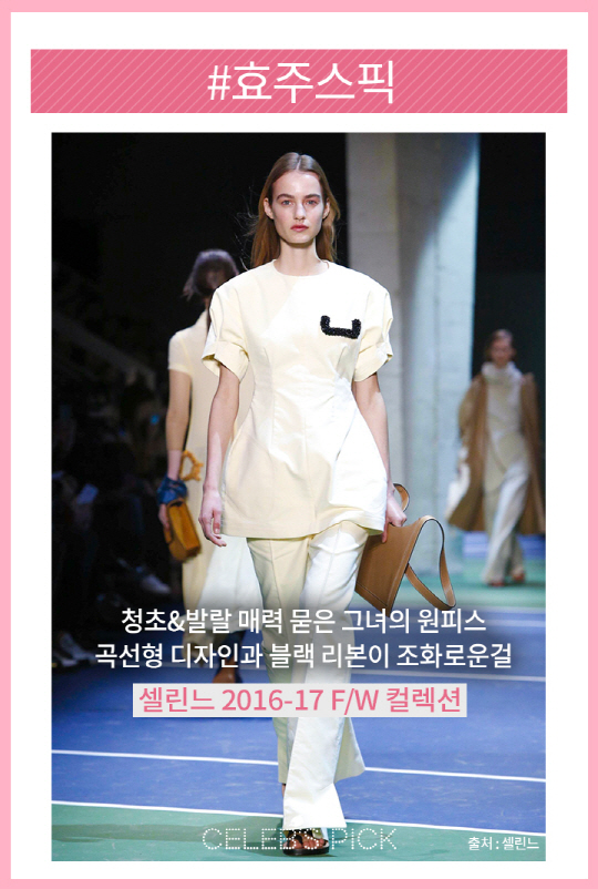 한효주는 셀린느 2016-17 F/W 컬렉션을 선택했습니다. 아방가르드한 곡선형 실루엣과 블랙 리본 포인트가 모던하면서도 유니크한 스타일인데요. 청초한 그녀를 좀 더 발랄하게 업그레이드 해준 스타일이랍니다.