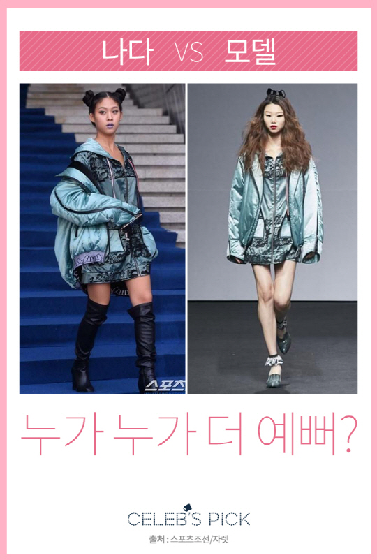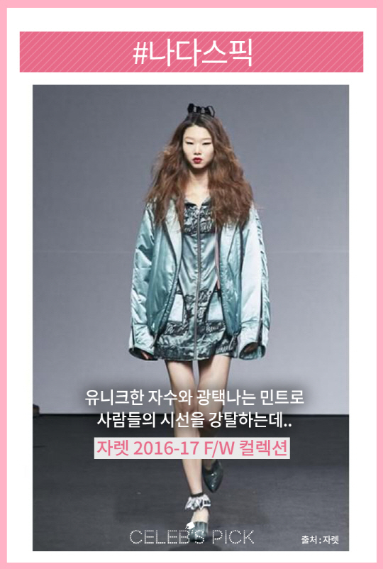 2017 S/S 서울헤라패션위크에 나타난 떠오르는 걸 크러쉬 샛별 나다는 강렬한 스트리트 무드의 룩을 선보였습니다. 그녀가 선택한 컬렉션 룩은 자렛의 2016-17 F/W 제품이었는데요. 유니크한 자수와 화려한 광택이 돋보이는 민트 패션으로 사람들의 시선을 강탈했답니다.