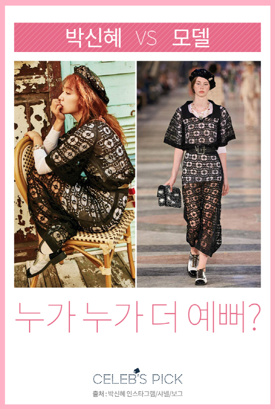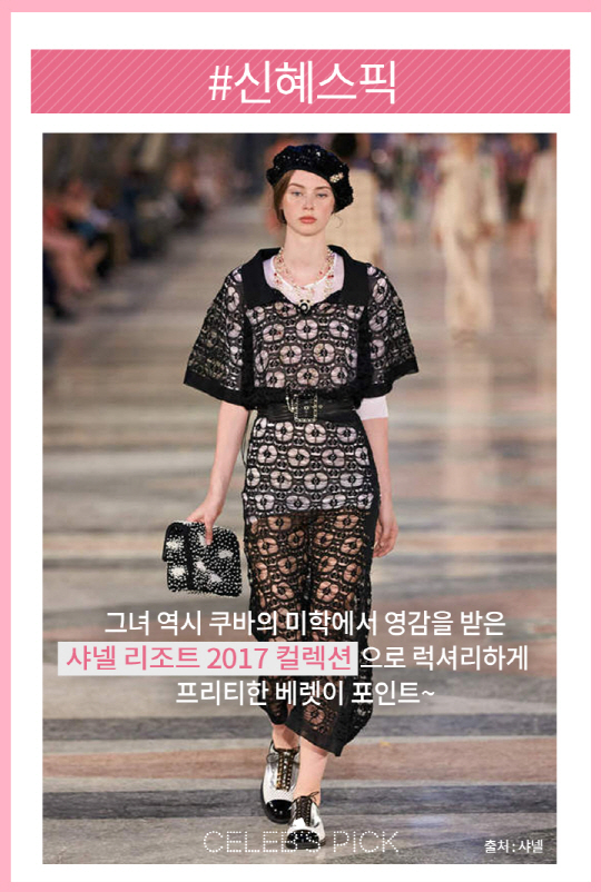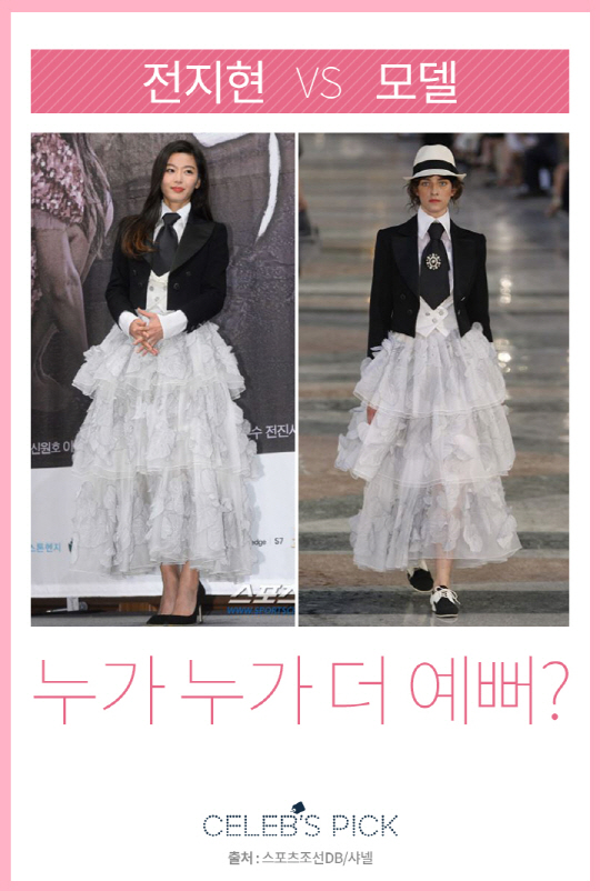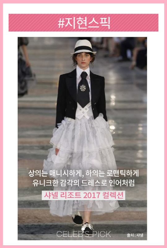 인어로 맹활약 중인 전지현은 샤넬 쿠바 리조트 2017 컬렉션 룩을 선택했습니다. 풍성하게 연출된 롱 티어드 스커트가 마치 인어의 모습을 연상시켜 많은 화제를 불러 일으키기도 했는데요. 상의는 매니시하게 하의는 로맨틱하게 두가지 무드가 공존하는 유니크한 드레스네요. 전지현은 스틸레토 힐로 좀 더 페미닌하게 연출했고요. 런웨이 속 모델은 로퍼와 파나마 햇으로 보이시한 포인트를 더했습니다. 어떤 스타일이 더 예쁘나요?