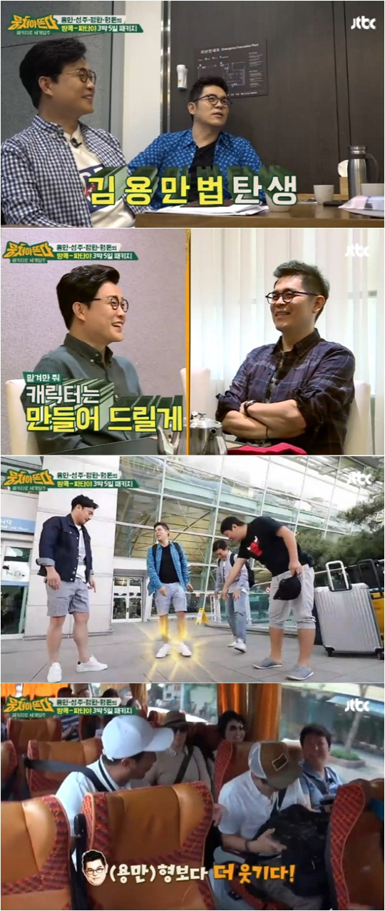 공항에서 그는 자연스러움을 추구한 정형돈 안정환과 달리 메이크업은 물론, 선글라스와 새 신발로 한껏 멋을 내고 등장해 동생들의 '옛날 예능인'이라는 디스 폭탄을 맞았다. 다들 비슷한 나이대라 공감하는 상황도 더러있었지만, 오랜만에 출연하는 리얼 버라이어티여서 유독 김용만에게 어색한 상황이 잦았다. 하지만 놀림에 멋쩍어 하면서도 "시청자들을 위해 흑채는 포기하지 않겠다"는 꿋꿋한 의지로 웃음을 자아냈다