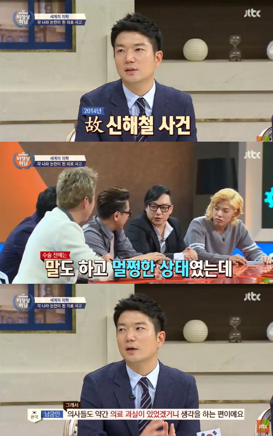 [스포츠조선닷컴 김준석 기자] '비정상회담' 응급의학과 전문의 남궁인이 출연해 가장 안타까운 의료사고로 故신해철의 사고를 꼽았다.