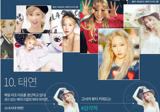새하얀 피부톤, 귀여운 미소까지 겸비한 태연은 현재까지 꾸준히 화장품 브랜드 모델에 발탁되며 K-뷰티 산업의 위상을 드높인 바 있다. 특히 세련된 금발 머리와 잘 어울리는 팝한 컬러의 메이크업은 감각적이고 화사하게 연출돼 대중의 많은 호평을 받았다.