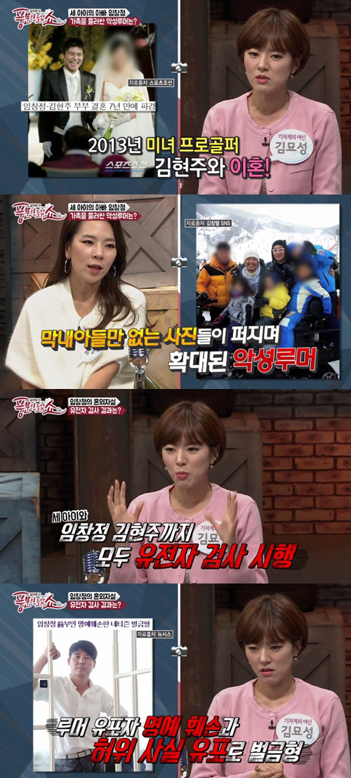 이에 또 다른 기자는 "인터넷 커뮤니티를 통해 퍼진 루머인데 임창정이 부인을 의심해서 아이들 유전자 검사를 했더니 막내아들이 혼외자라는 악성 루머가 퍼졌다"고 설명했다.