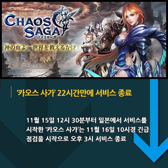 11월 15일 12시 30분부터 일본에서 서비스를 시작한 '카오스 사가'는 11월 16일 10시경 긴급 점검을 시작으로 오후 3시 서비스 종료