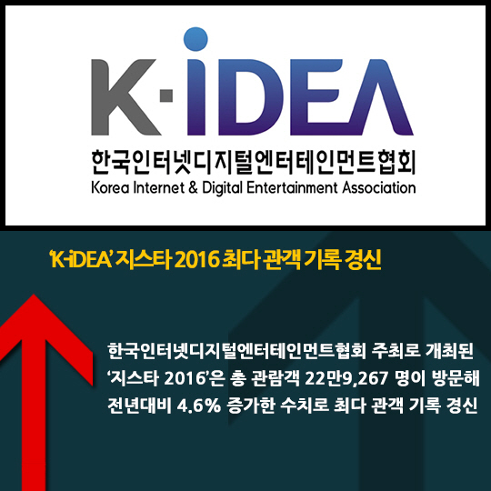 한국인터넷디지털엔터테인먼트협회 주최로 개최된 '지스타 2016'은 총 관람객 22만9,267 명이 방문해 전년대비 4.6% 증가한 수치로 최다 관객 기록 경신