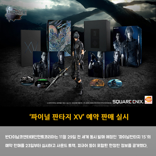 반다이남코엔터테인먼트코리아는 11월 29일 전 세계 동시 발매 에정인 '파이널판타지 15'의 예약 판매를 23일부터 실시하고 사운드 트랙, 피규어 등이 포함된 한정판 정보를 공개했다.