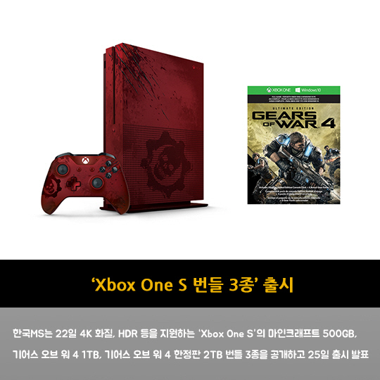한국MS는 22일 4K 화질, HDR 등을 지원하는 'Xbox One S'의 마인크래프트 500GB, 기어스 오브 워 4 1TB, 기어스 오브 워 4 한정판 2TB 번들 3종을 공개하고 25일 출시 발표