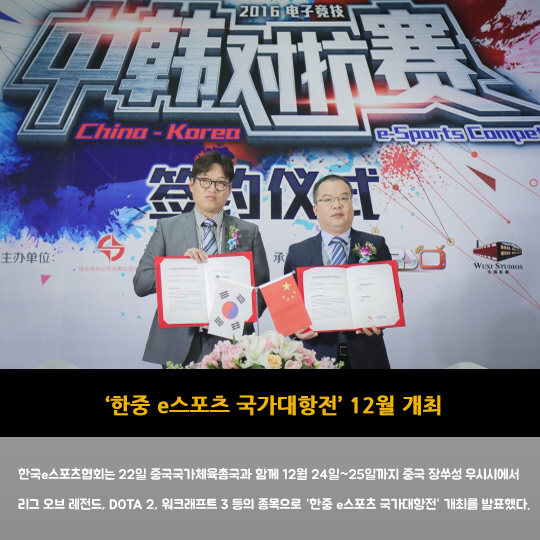 한국e스포츠협회는 22일 중국국가체육총국과 함께 12월 24일~25일까지 중국 장쑤성 우시시에서 리그 오브 레전드, DOTA 2, 워크래프트 3 등의 종목으로 '한중 e스포츠 국가대항전' 개최를 발표했다.