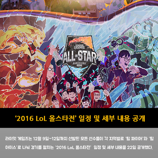 라이엇 게임즈는 12월 9일~12일까지 선발된 모든 선수들이 각 지역별로 '팀 파이어'와 '팀 아이스'로 나눠 경기를 펼치는 '2016 LoL 올스타전' 일정 및 세부 내용을 22일 공개했다.