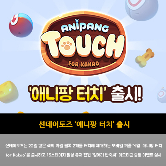 선데이토즈는 22일 같은 색의 과일 블록 2개를 터치해 제거하는 모바일 퍼즐 게임 '애니팡 터치 for Kakao'를 출시하고 15스테이지 달성 유저 전원 '덩어리 반죽씨' 이모티콘 증정 이벤트 실시