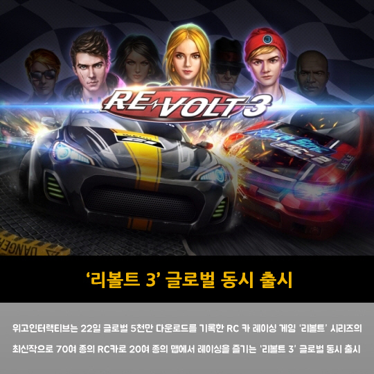 위고인터랙티브는 22일 글로벌 5천만 다운로드를 기록한 RC 카 레이싱 게임 '리볼트' 시리즈의 최신작으로 70여 종의 RC카로 20여 종의 맵에서 레이싱을 즐기는 '리볼트 3' 글로벌 동시 출시