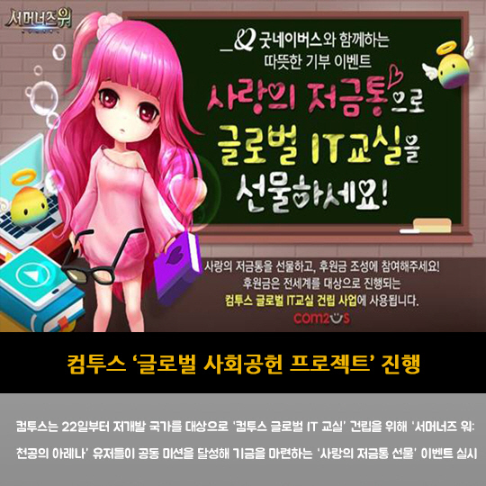 컴투스는 22일부터 저개발 국가를 대상으로 '컴투스 글로벌 IT 교실' 건립을 위해 '서머너즈 워: 천공의 아레나' 유저들이 공동 미션을 달성해 기금을 마련하는 '사랑의 저금통 선물' 이벤트 실시