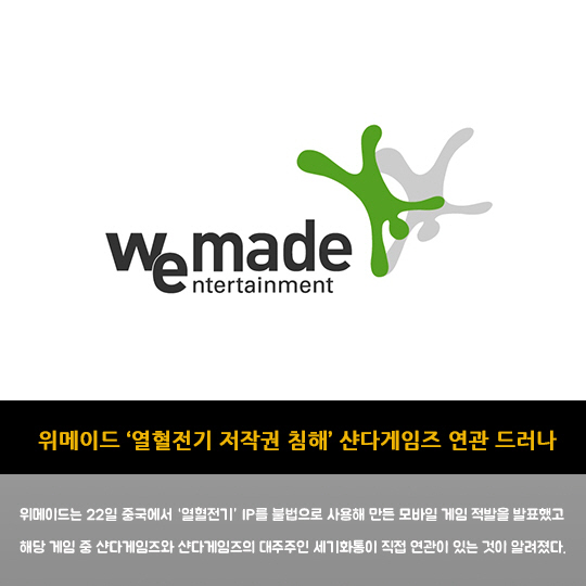 위메이드는 22일 중국에서 '열혈전기' IP를 불법으로 사용해 만든 모바일 게임 적발을 발표했고 해당 게임 중 샨다게임즈와 샨다게임즈의 대주주인 세기화통이 직접 연관이 있는 것이 알려졌다.