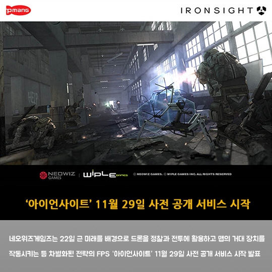 네오위즈게임즈는 22일 근 미래를 배경으로 드론을 정찰과 전투에 활용하고 맵의 거대 장치를 작동시키는 등 차별화된 전략의 FPS '아이언사이트' 11월 29일 사전 공개 서비스 시작 발표