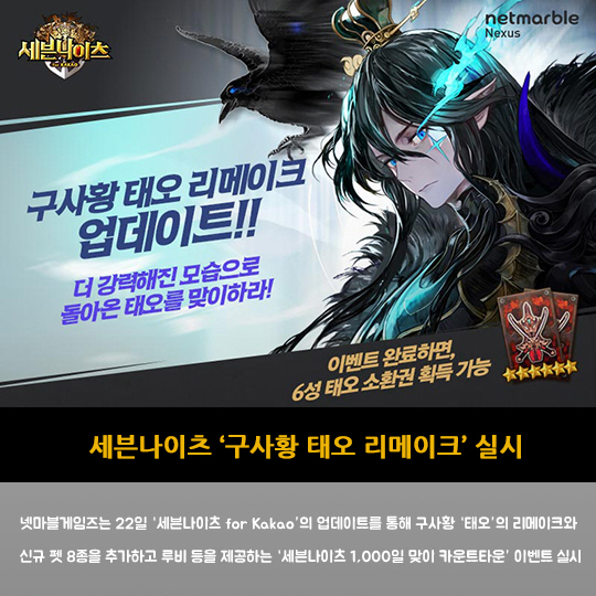넷마블게임즈는 22일 '세븐나이츠 for Kakao'의 업데이트를 통해 구사황 '태오'의 리메이크와 신규 펫 8종을 추가하고 루비 등을 제공하는 '세븐나이츠 1,000일 맞이 카운트타운' 이벤트 실시