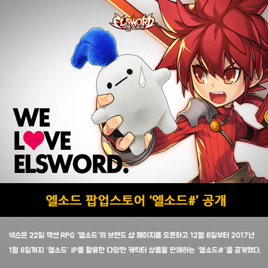 넥슨은 22일 액션 RPG '엘소드'의 브랜드 샵 페이지를 오픈하고 12월 8일부터 2017년 1월 8일까지 '엘소드' IP를 활용한 다양한 캐릭터 상품을 판매하는 '엘소드#'을 공개했다.