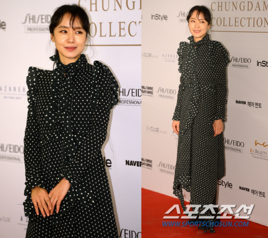 전도연은 페미닌한 디자인의 도트 패턴 드레스로 레드카펫을 물들였다. 흔히 도트 패턴은 '너무 유치해보여서...', '조금 촌스러워보여서...' 라는 이유로 쉽게 손이 가지 않는 아이템. 전도연은 그 편견을 와장창 깨뜨렸다. 하이넥 라인의 여성스러운 프릴 디테일과 숄더의 퍼프 슬리브는 고풍스러운 레트로 느낌을 더했고 언밸런스한 헴라인은 물론 패턴감의 흐름을 달리하려 허리 아래로 자연스럽게 휘감아 흐르는 도트 패턴의 물결은 여성스러움을 더했다. 전도연은 도트패턴 드레스, 이 하나의 아이템으로 귀여움, 사랑스러움, 여성스러움 모두를 연출했다. 역시 전도연이었다.
