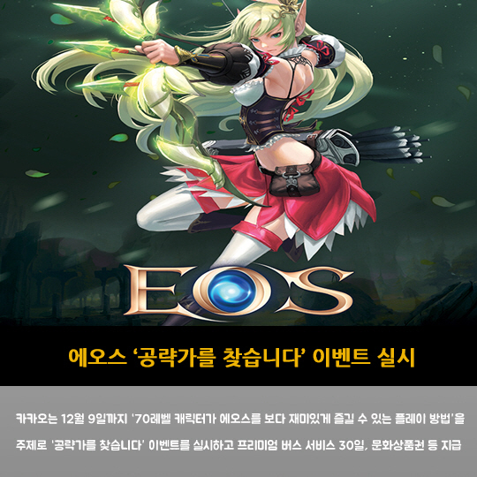 카카오는 12월 9일까지 '70레벨 캐릭터가 에오스를 보다 재미있게 즐길 수 있는 플레이 방법'을 주제로 '공략가를 찾습니다' 이벤트를 실시하고 프리미엄 버스 서비스 30일, 문화상품권 등 지급