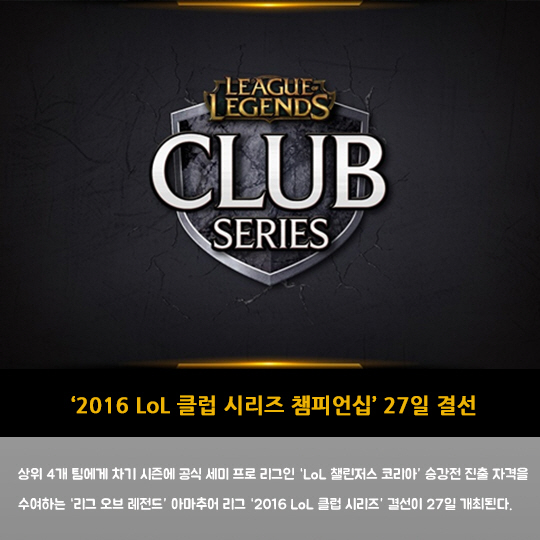 상위 4개 팀에게 차기 시즌에 공식 세미 프로 리그인 'LoL 챌린저스 코리아' 승강전 진출 자격을 수여하는 '리그 오브 레전드' 아마추어 리그 '2016 LoL 클럽 시리즈' 결선이 27일 개최된다.