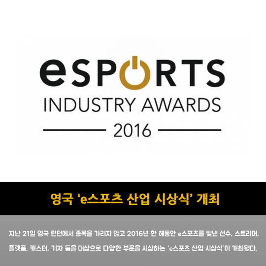 지난 21일 영국 런던에서 종목을 가리지 않고 2016년 한 해동안 e스포츠를 빛낸 선수, 스트리머, 플랫폼, 캐스터, 기자 등을 대상으로 다양한 부문을 시상하는 'e스포츠 산업 시상식'이 개최됐다.