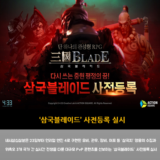 네시삼십삼분은 23일부터 언리얼 엔진 4로 구현된 유비, 관우, 장비, 여포 등 '삼국지' 영웅의 수집과 위촉오 3개 국가 간 실시간 전쟁을 다룬 대규모 PvP 콘텐츠를 선보이는 '삼국블레이드' 사전등록 실시