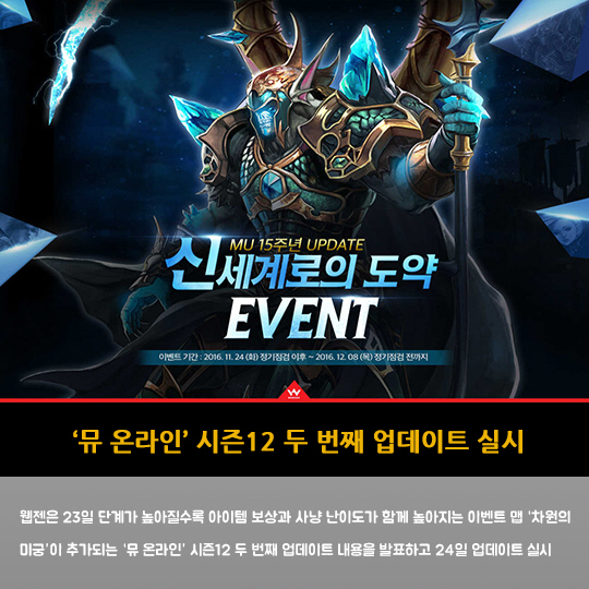 웹젠은 23일 단계가 높아질수록 아이템 보상과 사냥 난이도가 함께 높아지는 이벤트 맵 '차원의 미궁'이 추가되는 '뮤 온라인' 시즌12 두 번째 업데이트 내용을 발표하고 24일 업데이트 실시