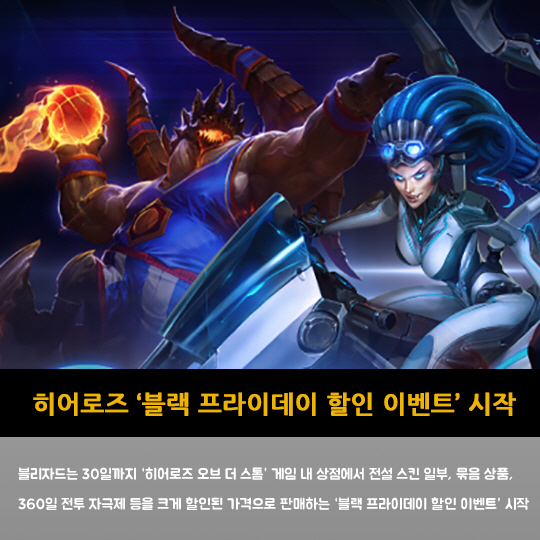 블리자드는 30일까지 '히어로즈 오브 더 스톰' 게임 내 상점에서 전설 스킨 일부, 묶음 상품, 360일 전투 자극제 등을 크게 할인된 가격으로 판매하는 '블랙 프라이데이 할인 이벤트' 시작