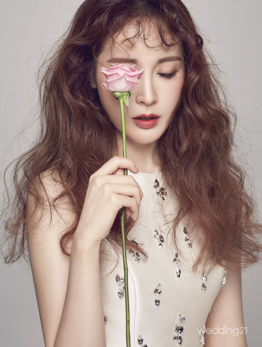 메이크업 역시 베이스를 은은하게 광채가 나도록 하여 러블리한 로즈핑크로 눈매를 연출해 신비로운 느낌을 살렸으며 레드 로즈 컬러로 입술에 포인트를 줘 어린 신부를 표현했다.