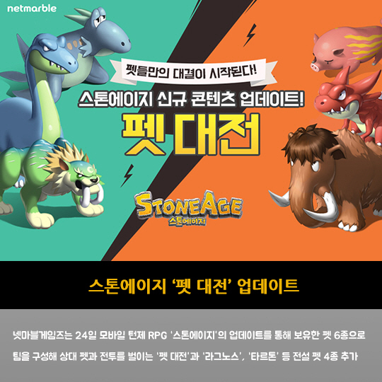 넷마블게임즈는 24일 모바일 턴제 RPG '스톤에이지'의 업데이트를 통해 보유한 펫 6종으로 팀을 구성해 상대 펫과 전투를 벌이는 '펫 대전'과 '라그노스', '타르톤' 등 전설 펫 4종 추가