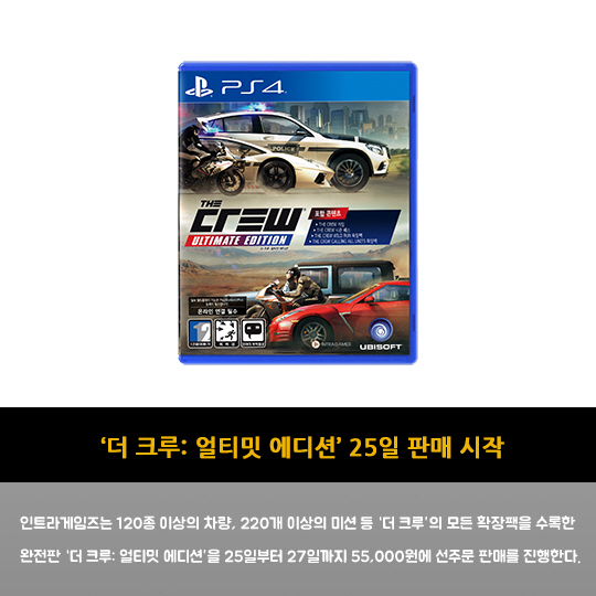 인트라게임즈는 120종 이상의 차량, 220개 이상의 미션 등 '더 크루'의 모든 확장팩을 수록한 완전판 '더 크루: 얼티밋 에디션'을 25일부터 27일까지 55,000원에 선주문 판매를 진행한다.