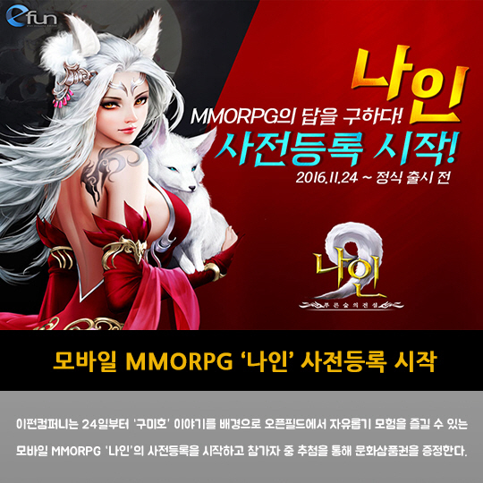 이펀컴퍼니는 24일부터 '구미호' 이야기를 배경으로 오픈필드에서 자유롭기 모험을 즐길 수 있는 모바일 MMORPG '나인'의 사전등록을 시작하고 참가자 중 추첨을 통해 문화삼품권을 증정한다.