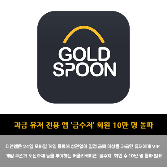 디앤엠은 24일 모바일 게임 종류에 상관없이 일정 금액 이상을 과금한 유저에게 VIP 게임 쿠폰과 도전과제 등을 부여하는 어플리케이션 '금수저' 회원 수 10만 명 돌파 발표