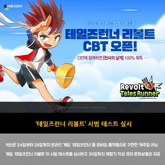 넥슨은 24일부터 28일까지 온라인 게임 '테일즈런너'를 모바일 플랫폼으로 구현한 캐주얼 러닝 게임 '테일즈런너 리볼트'의 시범 테스트를 실시하고 30일까지 체험기 작성 유저 문화상품권 지급
