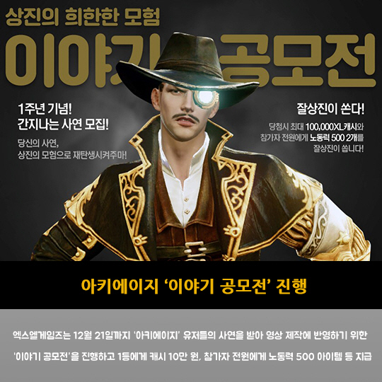 엑스엘게임즈는 12월 21일까지 '아키에이지' 유저들의 사연을 받아 영상 제작에 반영하기 위한 '이야기 공모전'을 진행하고 1등에게 캐시 10만 원, 참가자 전원에게 노동력 500 아이템 등 지급