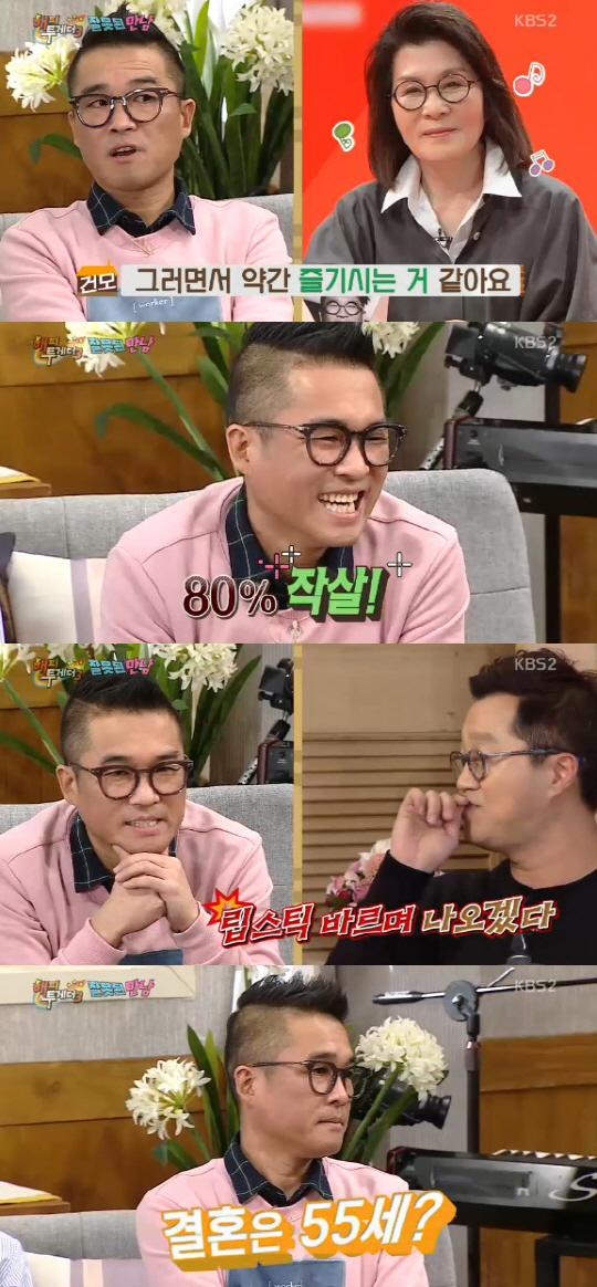 또 김건모는 "어머니가 서장훈과 탁재훈이 깨지는 걸 보고 결혼하라는 말을 안 하신다"며 느닷없는 실명 토크로 웃음을 자아냈다. 그는 "탁재훈은 내가 축가 불러줬다"며 "내가 축가 부른 커플 80%가 작살났다. 유일하게 잘살고 있는 부부가 손범수-진양혜다"라고 말해 폭소케 했다.