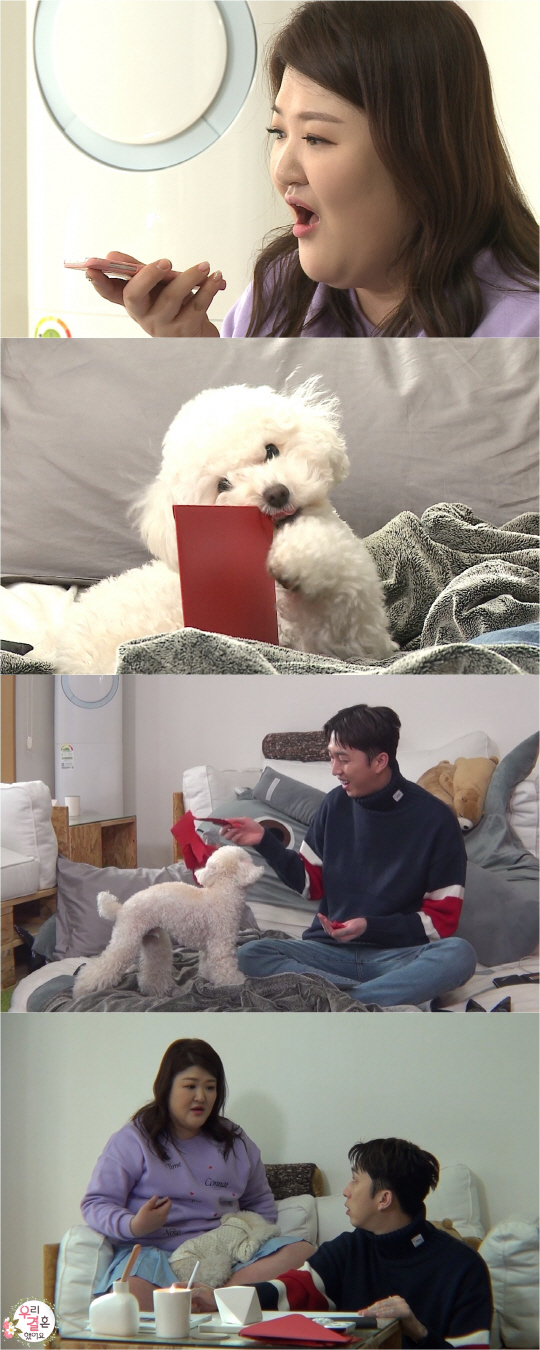 그러나 두 사람의 결혼생활이 시작부터 난관에 봉착할 것임이 예고되며 더욱 기대감을 높이고 있는 것. 슬리피와 함께 살고 있는 반려견 퓨리는 빨간봉투를 보자마자 눈에 불을 키며 돌진해 이를 발기발기 찢었고, 이에 슬리피는 이국주에게 "100조각이 났어"라며 하소연을 늘어놓았다는 전언.