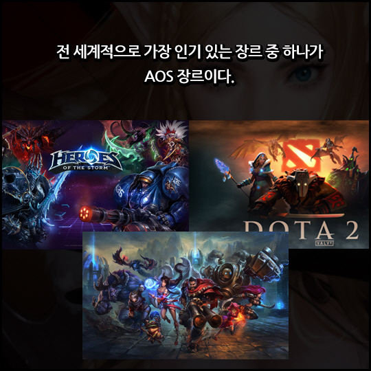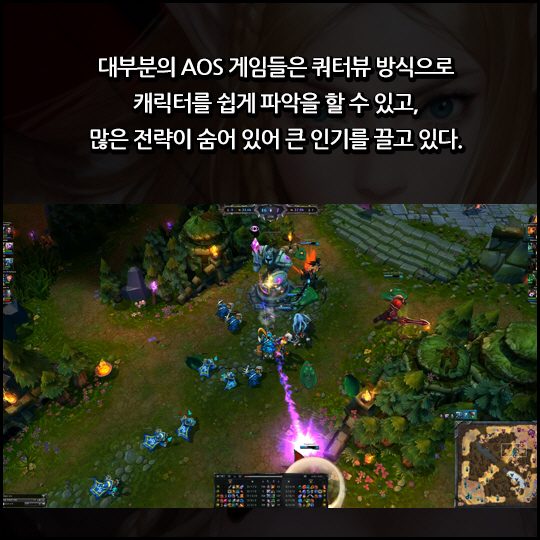 대부분의 AOS 게임들은 쿼터뷰 방식으로캐릭터를 쉽게 파악을 할 수 있고,많은 전략이 숨어 있어 큰 인기를 끌고 있다.