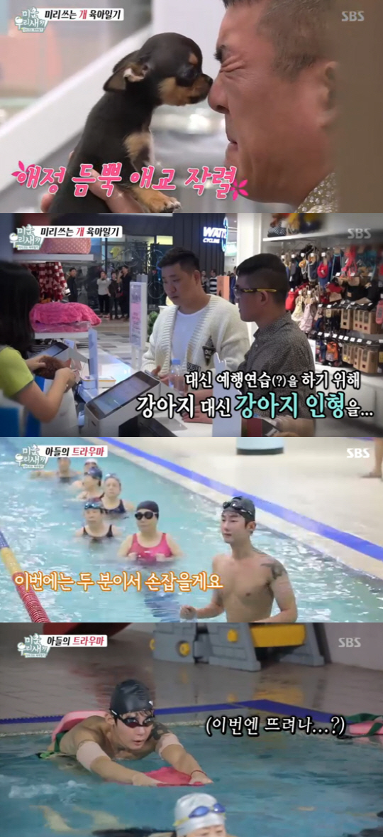 어머님들과 몸풀기 운동을 마친 허지웅은 본격 수영 교육에 나섰다. 발차기 100회 후 키 판을 잡고 앞으로 나가려던 허지웅은 얼마가지 못해 물 밖으로 나와 거친 숨을 몰아쉬었다.